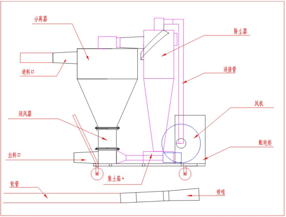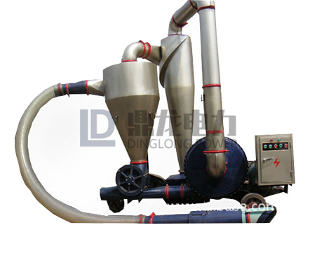 气力输送机-吸粮机主要有高压风机、风量调节阀、分离筒、闭风器、连接管路、吸咀和输送管等部分组成。其工作原理是,由高压风机产生的负压气流经吸咀,软管将物料吸入,通过分离筒,空气与物料分离,物料旋转向下落到闭风器,经闭风器到风机出口端,由正压气流通过输送管路压送到需要的地方,与物料分离后则向上通过分离筒的筛网筒和连接管路的风量调节进入风机。